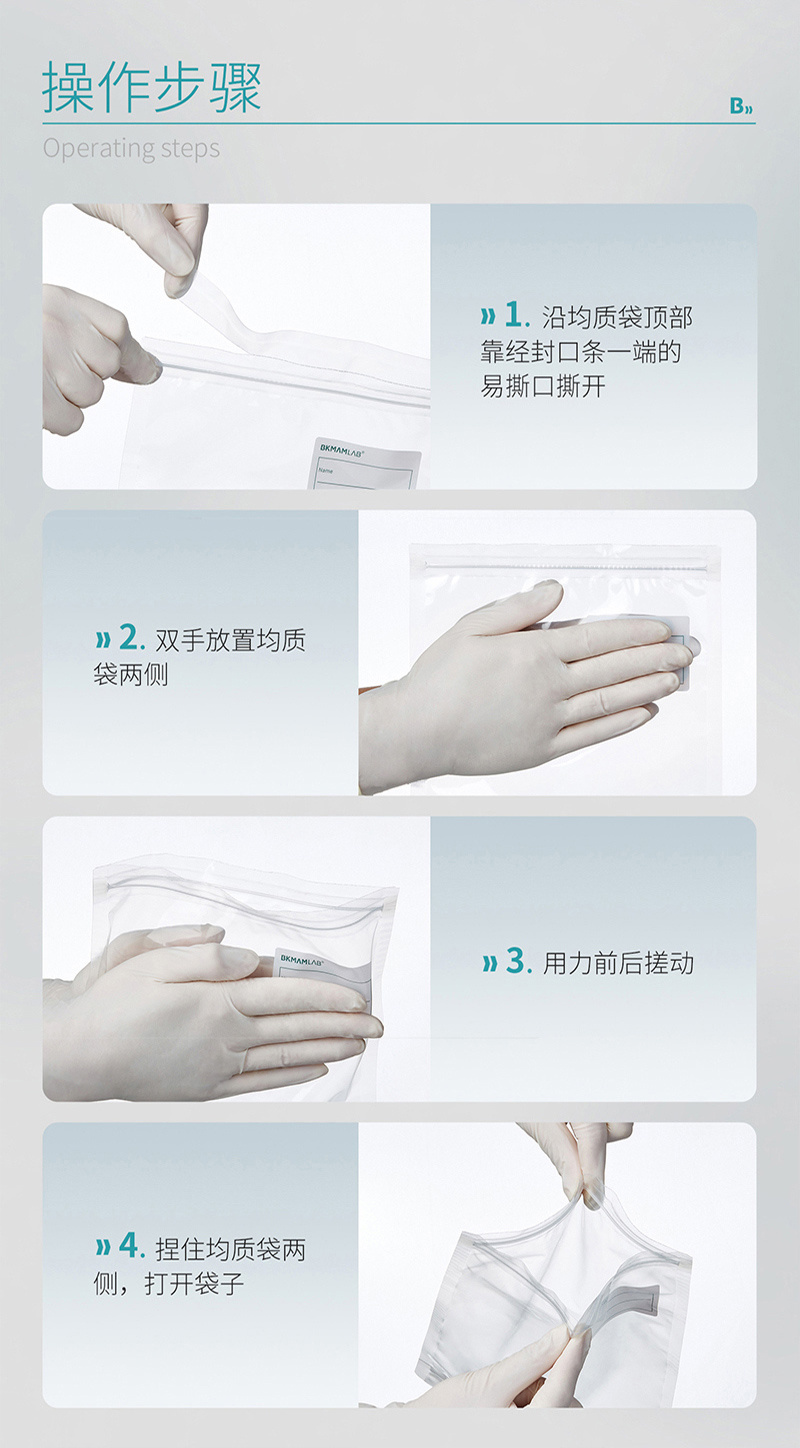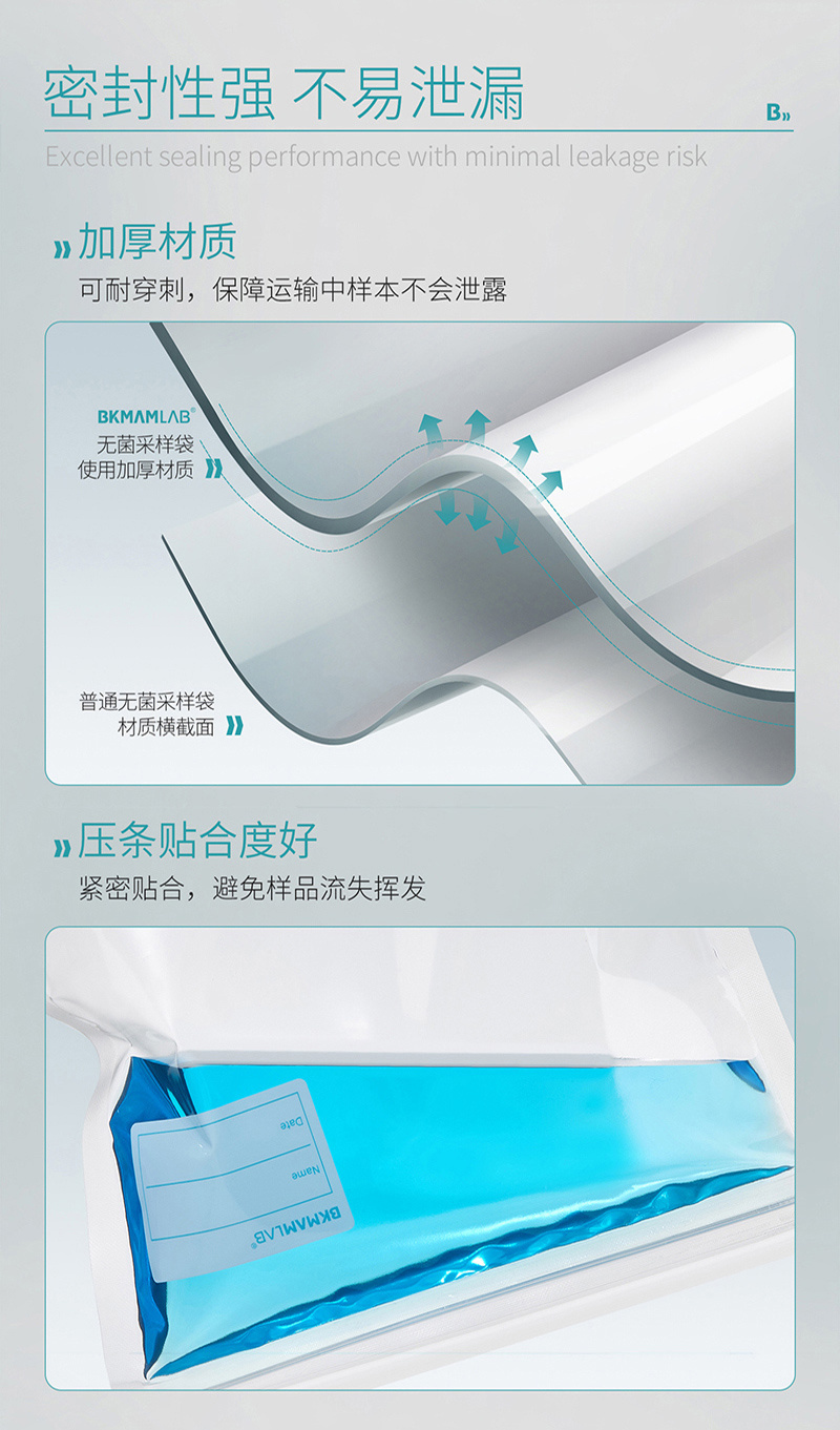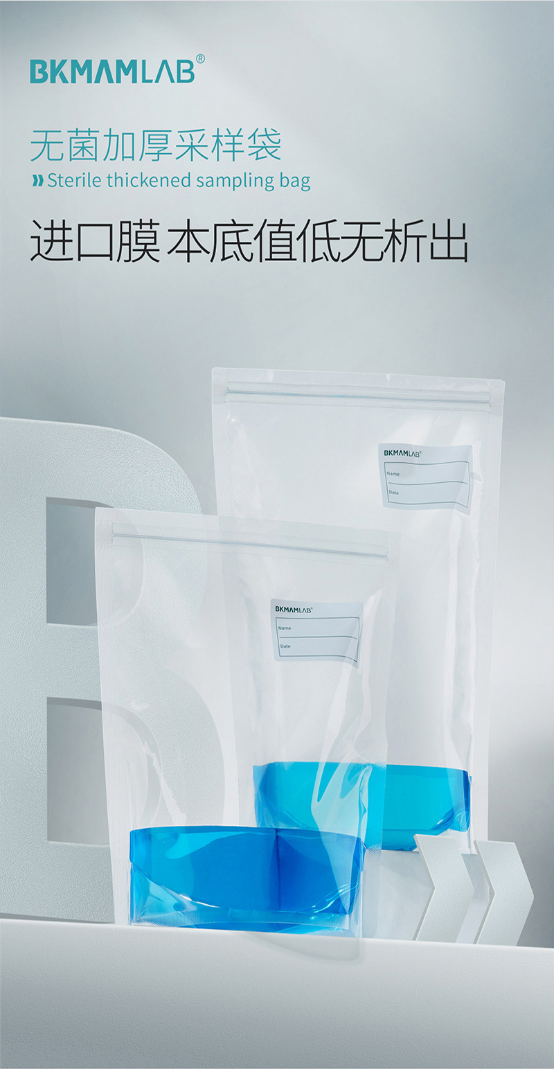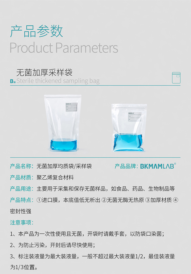 ·聚乙烯复合材质、透明、柔韧性好 ·袋底宽型焊接技术,抗冲击,防破裂 ·自封口包装防污染 ·规格齐全,适用于无菌采样、均质等 ·环氧乙烷灭菌(EO) ·可站立设计,有效防止漏液等,取用方便 ·厚度:单面9.5丝(0.095mm),双面19丝(0.19mm) ·本产品为一次性使用且无菌,开袋时请戴手套,以防袋口染菌 ·为了防止污染,开封后请尽快使用 ·标注装水量为最大装水量,一般不超过最大装水量的1/2,最佳装水量为1/3位置