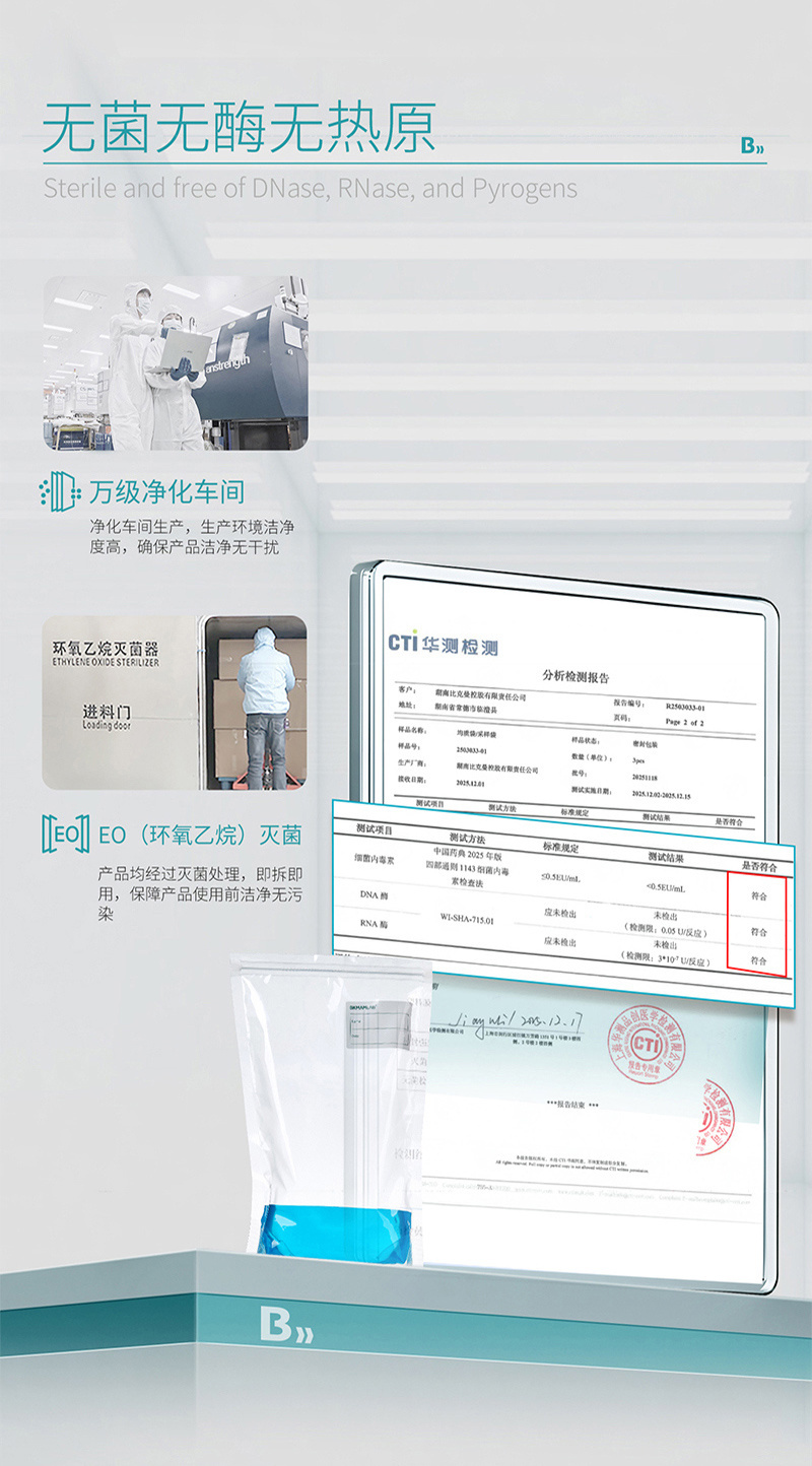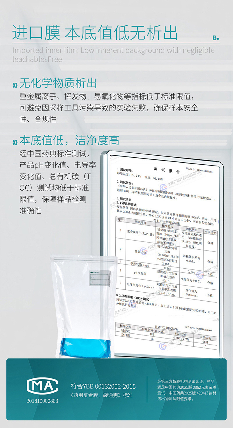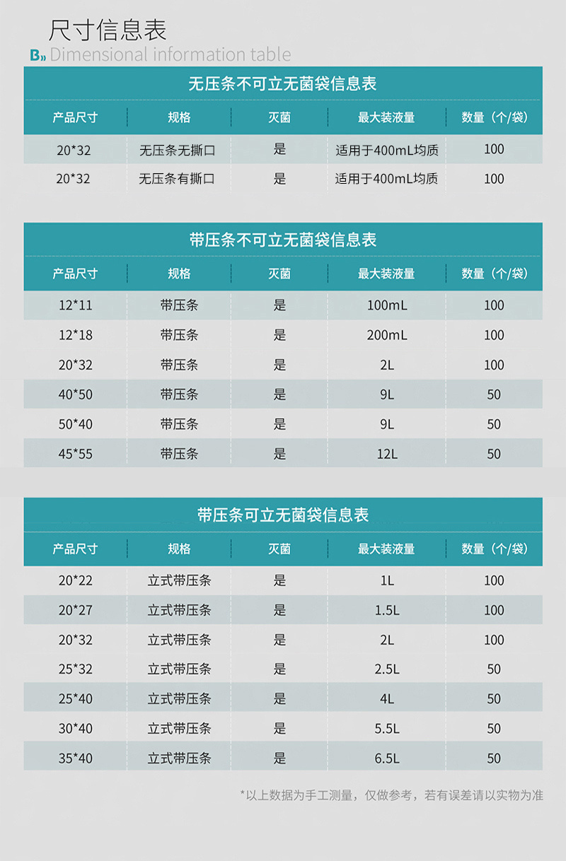·聚乙烯复合材质、透明、柔韧性好 ·袋底宽型焊接技术,抗冲击,防破裂 ·自封口包装防污染 ·规格齐全,适用于无菌采样、均质等 ·环氧乙烷灭菌(EO) ·可站立设计,有效防止漏液等,取用方便 ·厚度:单面9.5丝(0.095mm),双面19丝(0.19mm) ·本产品为一次性使用且无菌,开袋时请戴手套,以防袋口染菌 ·为了防止污染,开封后请尽快使用 ·标注装水量为最大装水量,一般不超过最大装水量的1/2,最佳装水量为1/3位置