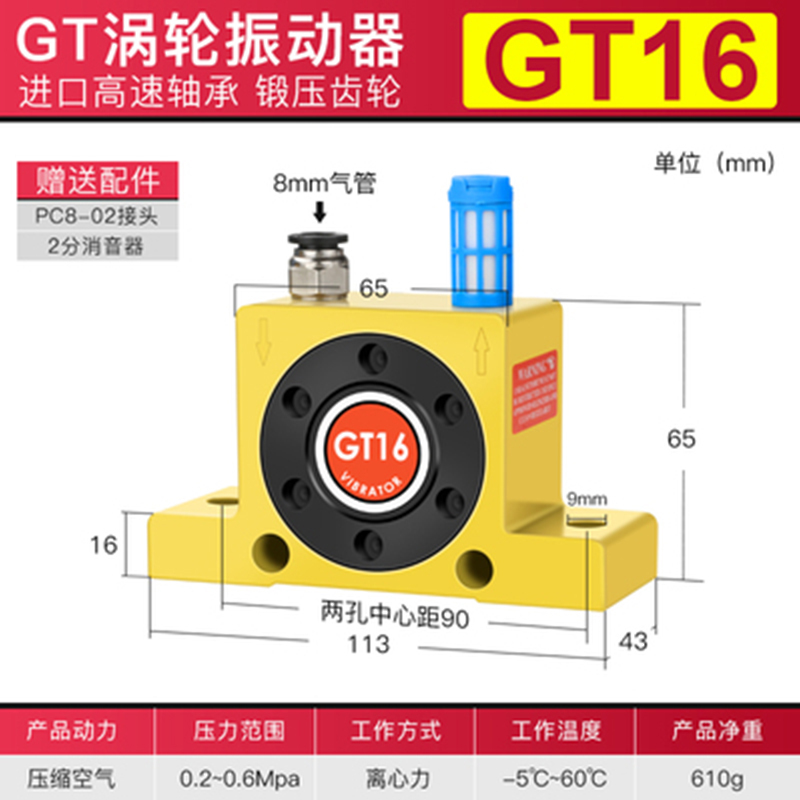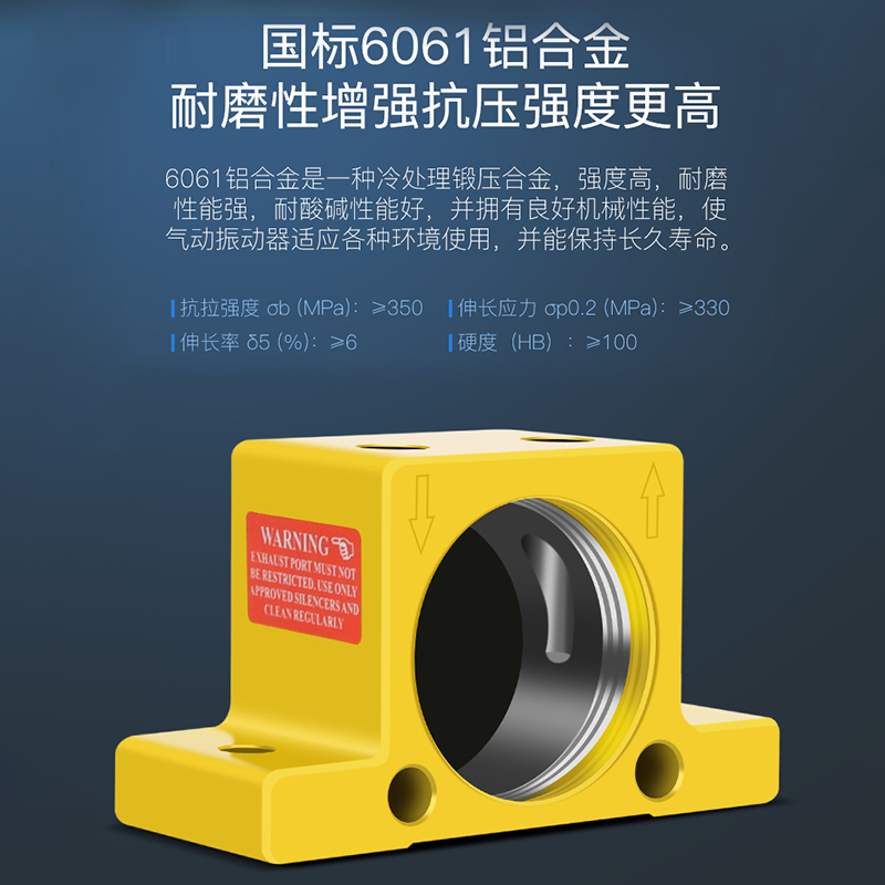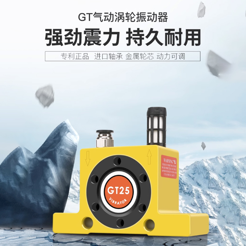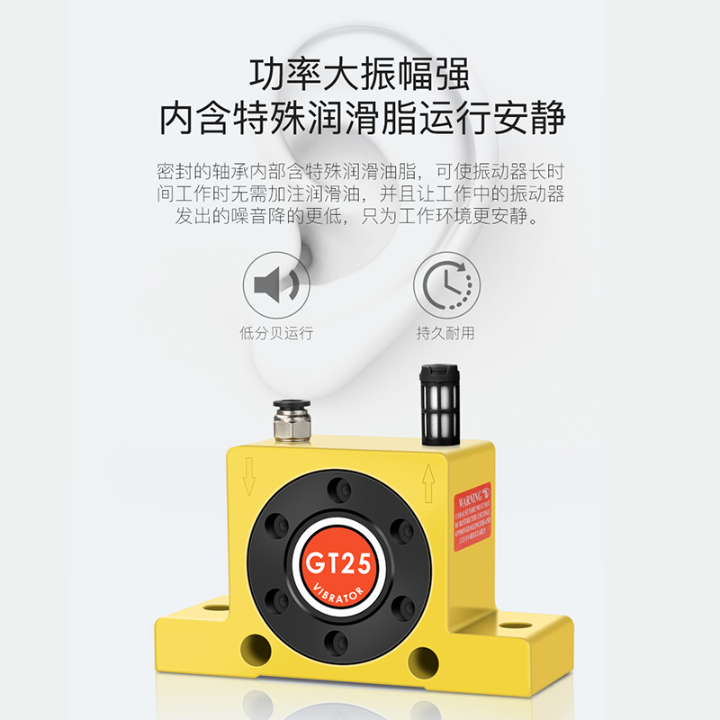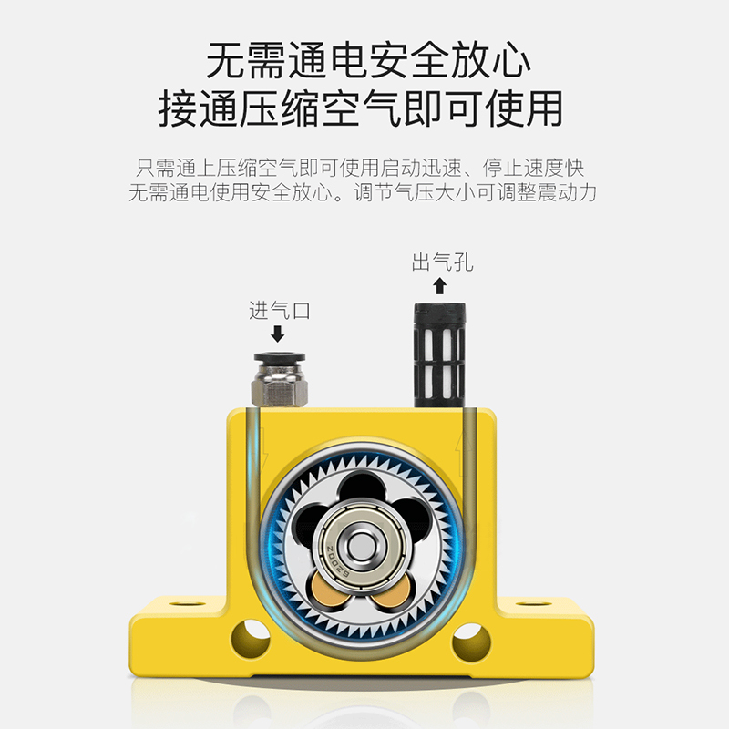 ·气动振动器以压缩空气作为动力源,耗气量小,既安全又节能。是在冷冻或高温环境中使用的理想装置,而且其体积小、故障少,安装及维护简易