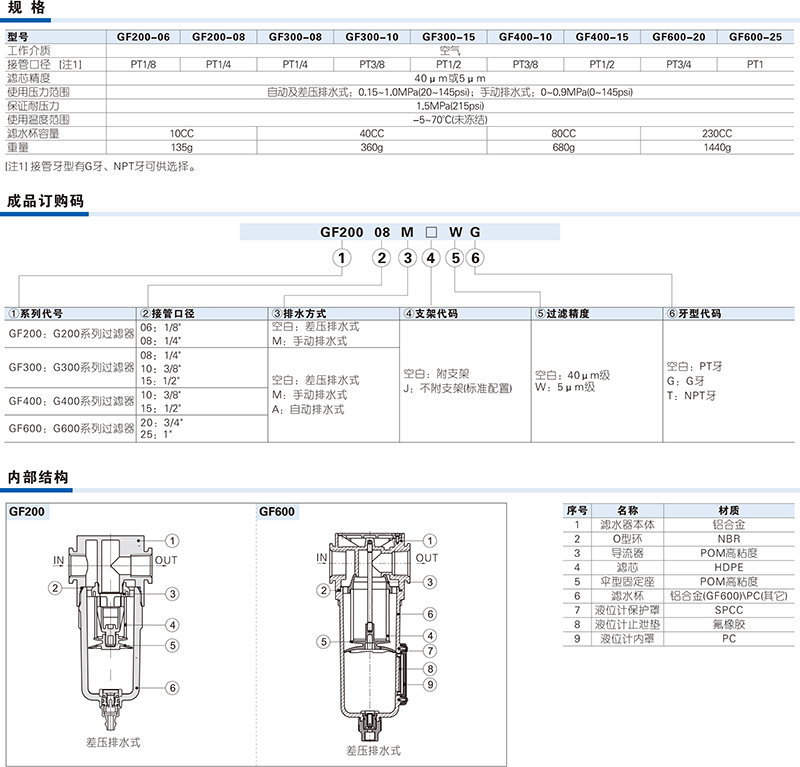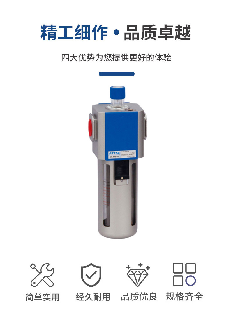 ·独特的导流结构,使流过的气体产生适当的旋转,从而更有效地分离气体中的液体并可靠地过滤固体颗粒 ·压力损失小,分水效率高,水杯容量大 ·过滤精度5μm、4μm可选 ·有手动、差压及自动排水等三种排水形式可供选择 ·可选择使用固定支架安装