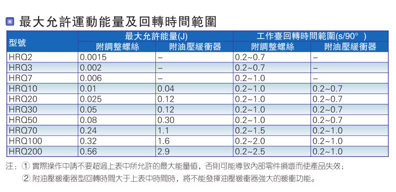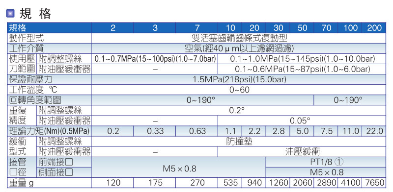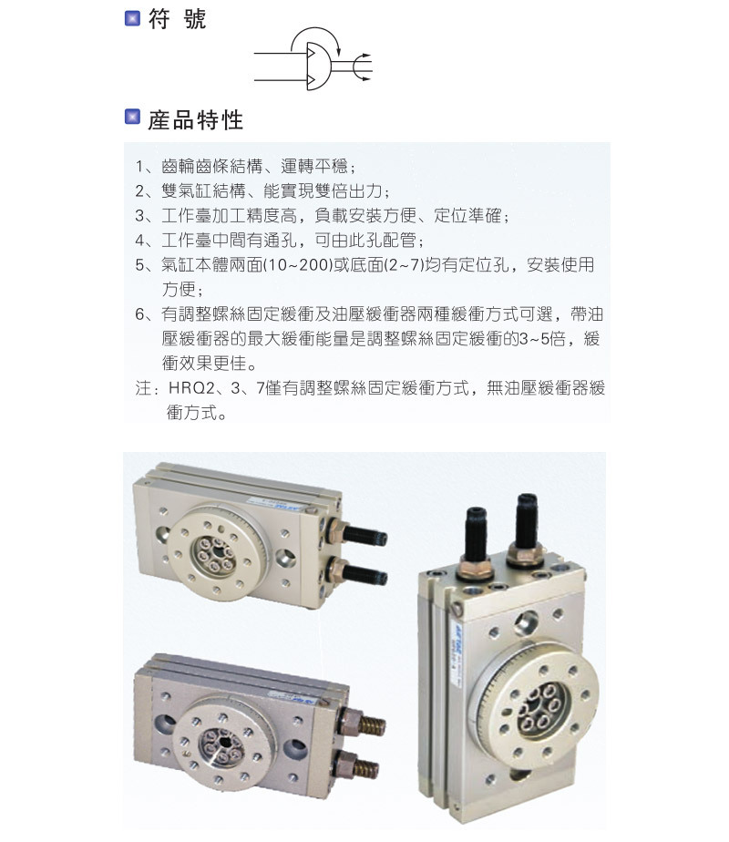 ·齿轮齿条结构、运转平稳 ·双气缸结构、能实现双倍出气 ·工作台加工精度高,负载安装方便、定位准确 ·工作台中间有通孔,可由此孔配管 ·气缸本体两面(100-200)或底面(2-7)均有定位孔,安装使用方便 ·有调整螺丝固定缓冲及油压缓冲器两种缓冲方式可选,带油压缓冲器缓冲能量是调整螺丝固定缓冲的3-5倍,缓冲效果更佳