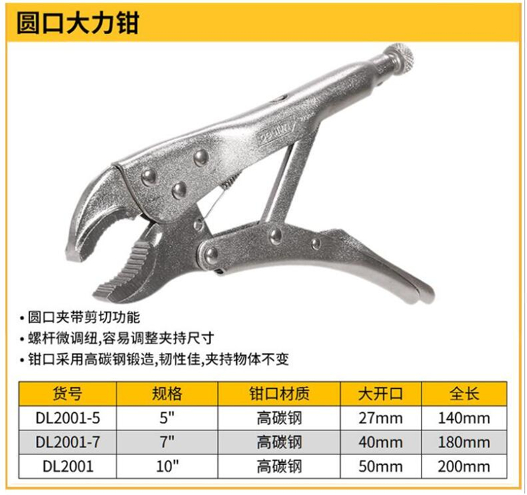 得力工具 DL2001-5 圆口大力钳(银) 5"(单位:把)