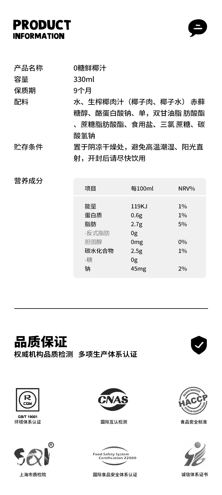 椰子知道 0糖鲜椰汁330ml*6瓶/箱