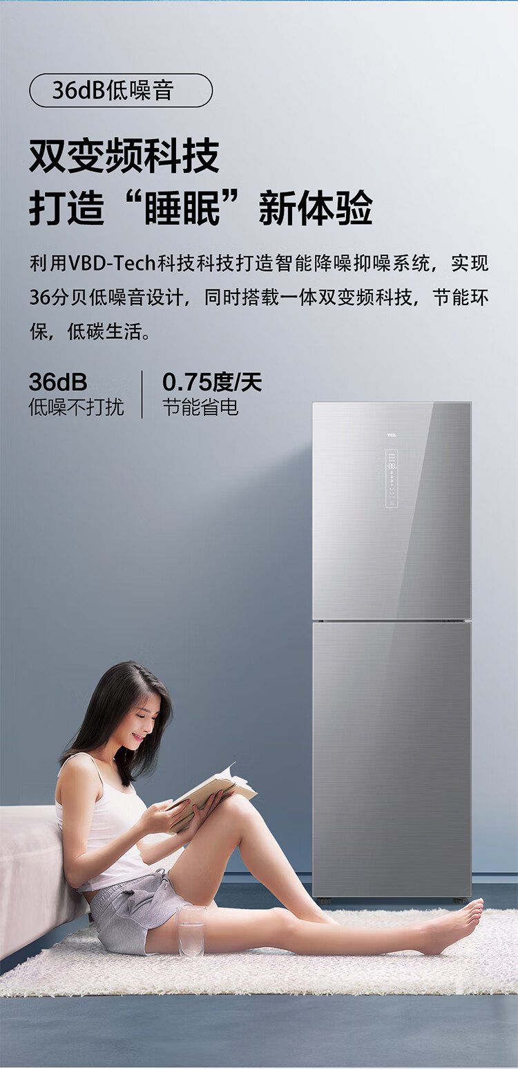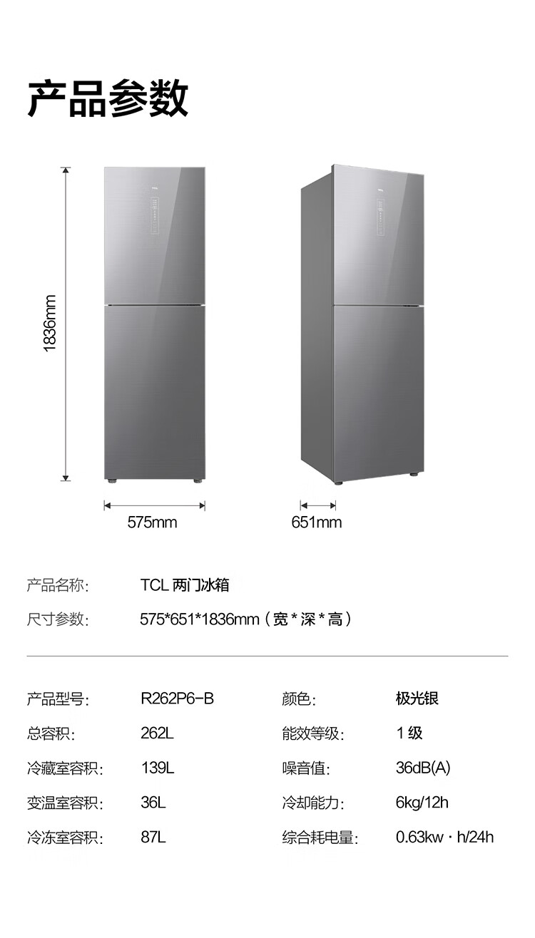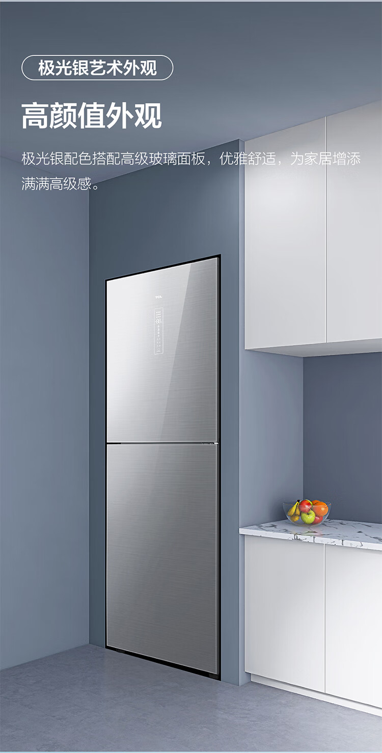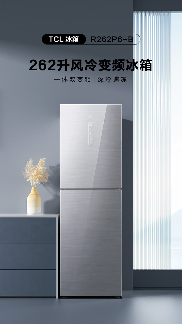 TCL R262P6-B 262升冰箱 两门三温区一体变频 -32℃深冷速冻AAT负氧离子养鲜262L 极光银