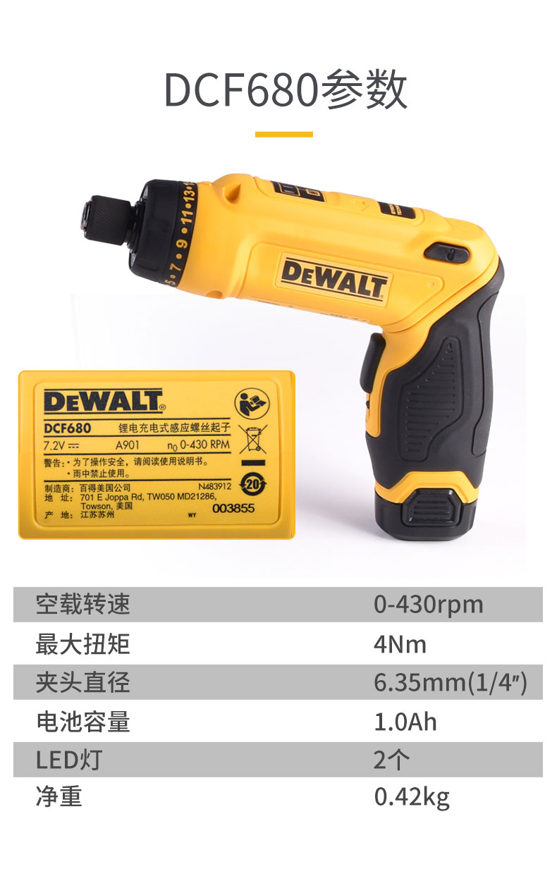 ·产品名称:得伟 / 7.2V锂电充电式感应螺丝起子 2x1.0Ah电池套装 DCF680G2-A9 4F4703