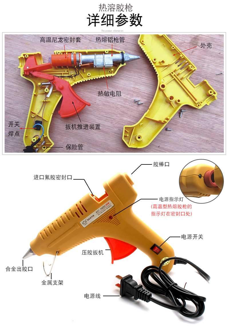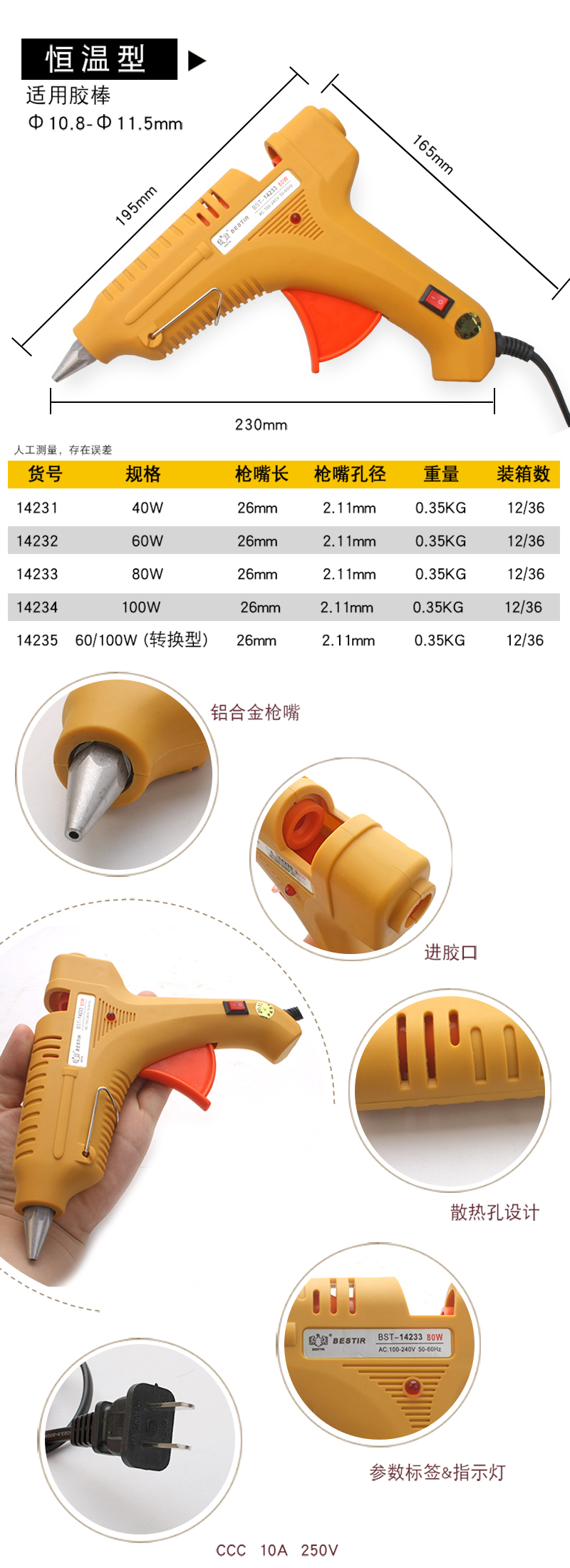 ·此产品采用高科技陶瓷PTC热敏电阻作为发热元件,升温速度快,恒温准确,在100v至240v之间交流或直流电源中可正常使用,出胶均匀,快速,使用寿命长,内置安全保险丝 ·电气绝缘强度在通电3750v/分钟是不击穿,耐电压330v/3分钟