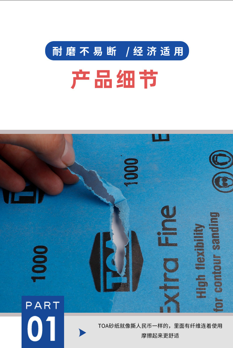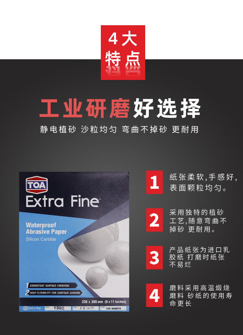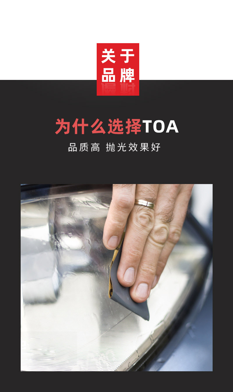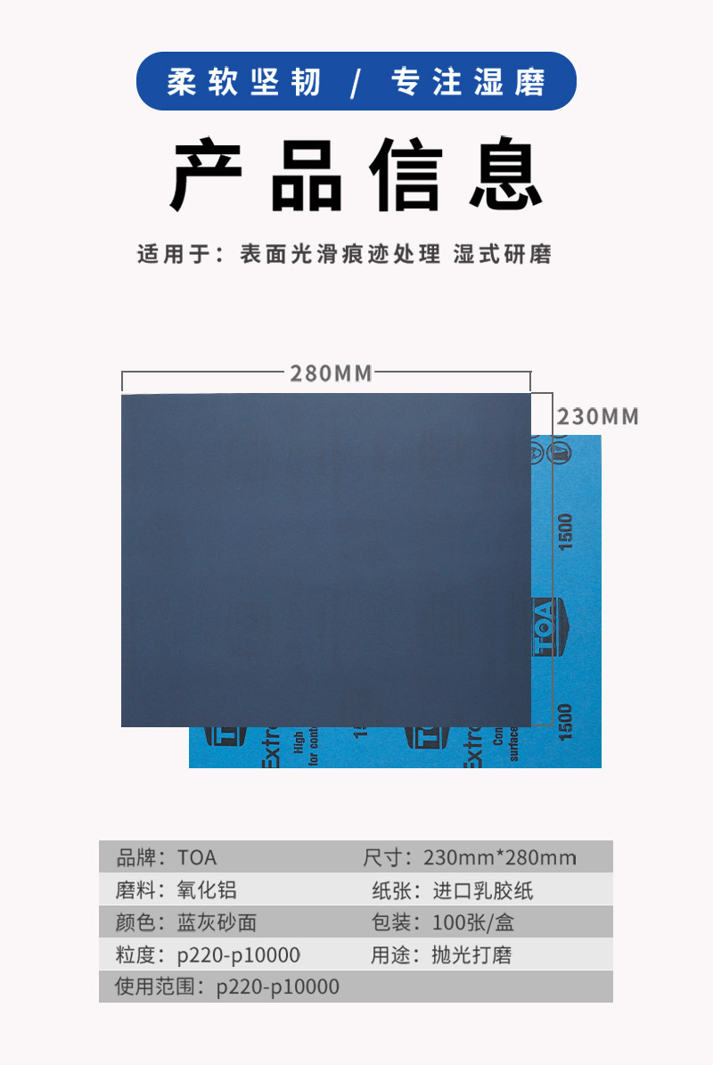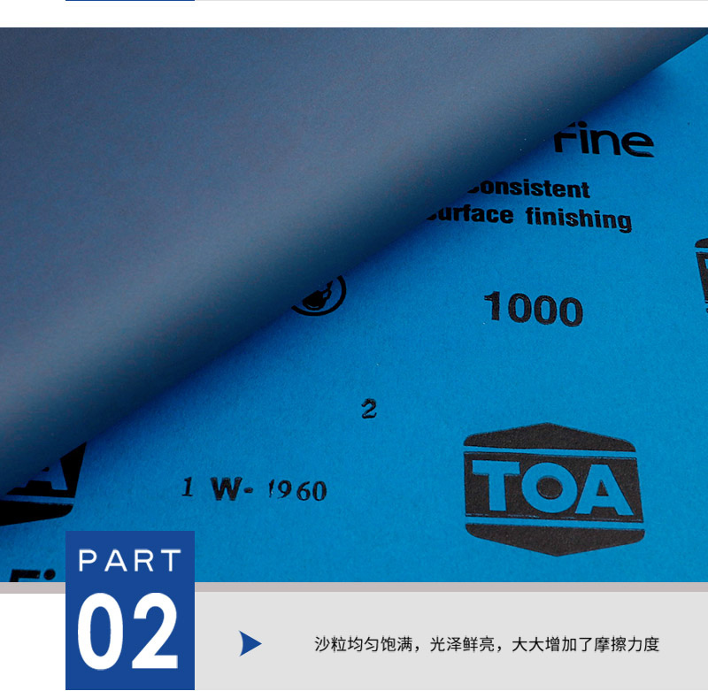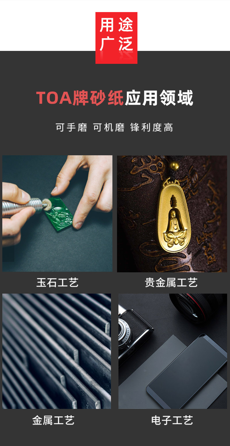 ·TOA砂纸采用纳米植砂工艺,广泛应用于工业超精细精面打磨抛光工作,以耐磨不掉砂享誉行业内