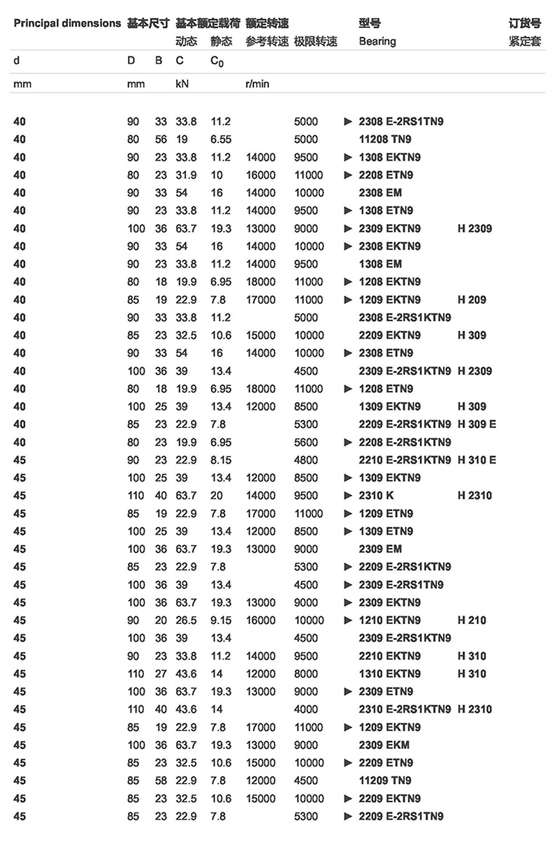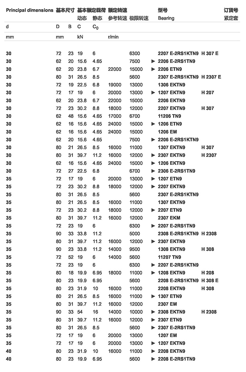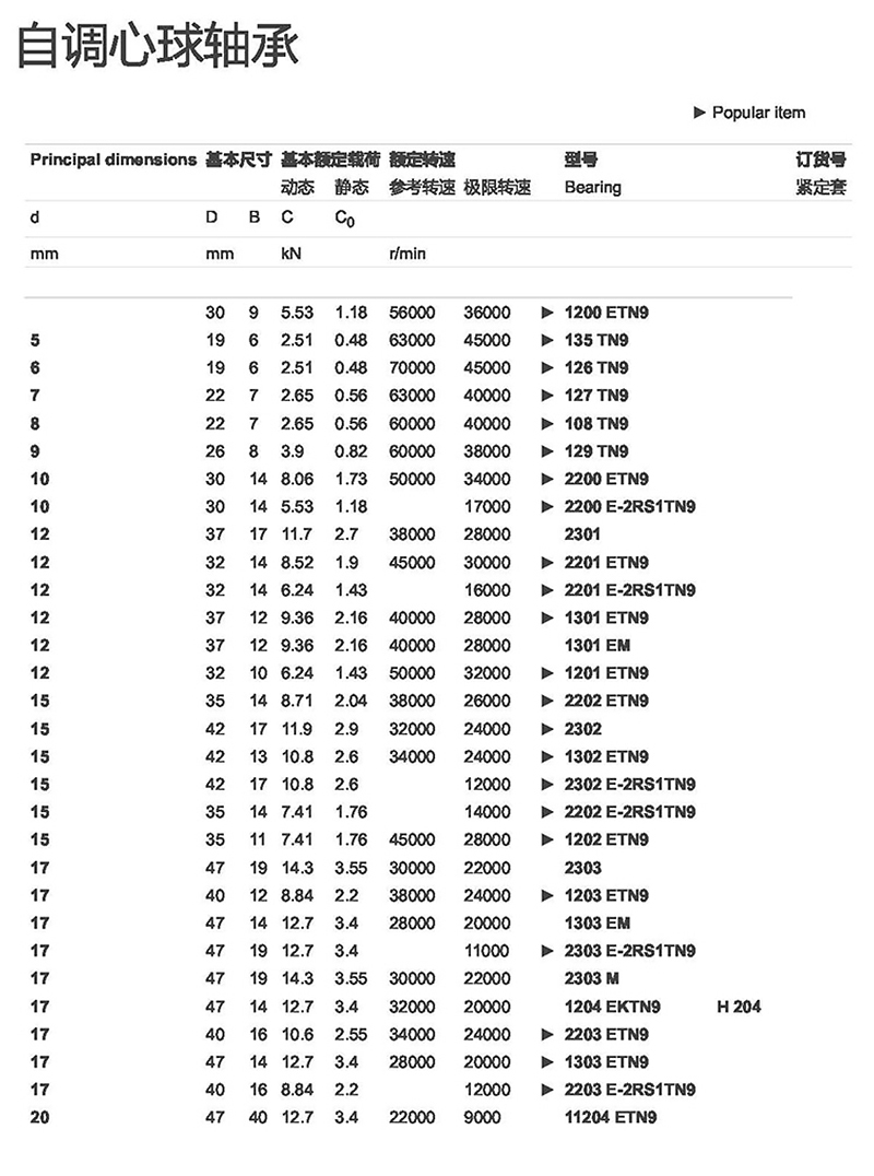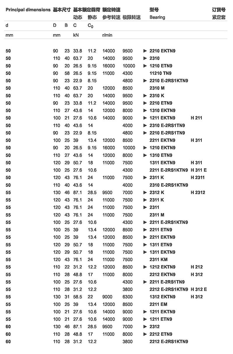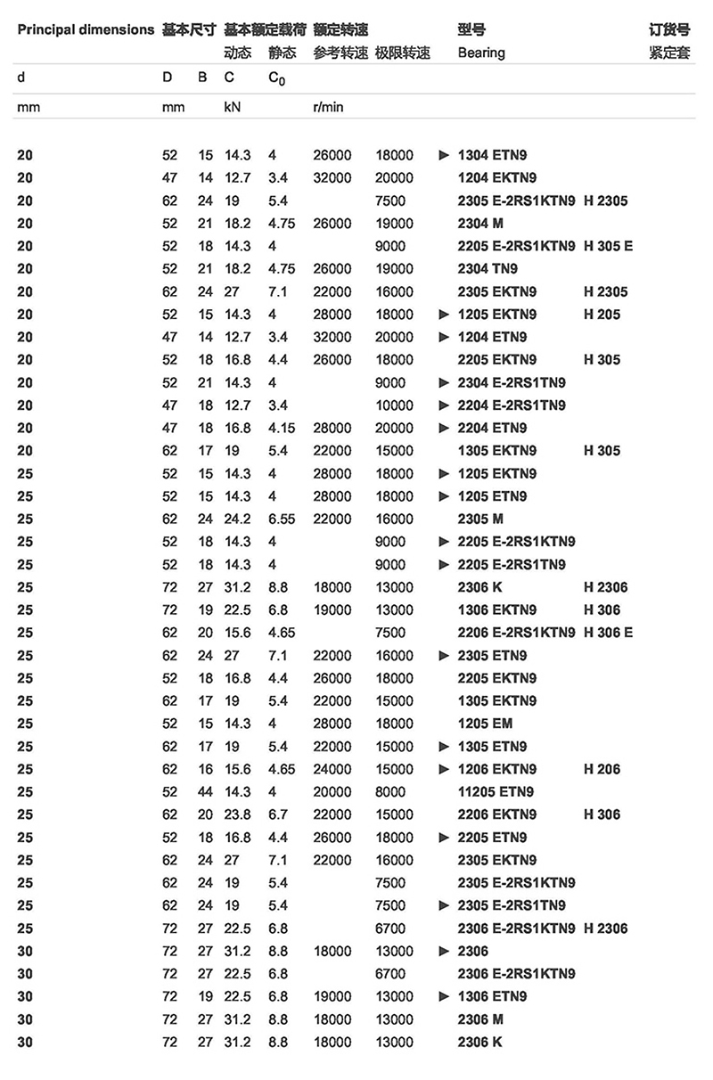 ·圆柱孔调心球轴承带有两列滚球和在外圈中的弧面滚道,导致轴承能够自动调心,并且能够承受轴与轴承座之间的角度误差,特别适用于容易出现轴挠曲和不对中的工况。此外,调心球轴承的摩擦是所有滚动轴承中较低的,使其即使在高速转速下温度上升仍旧缓慢。圆柱孔调心球轴承的制造商物料号后缀的含义如下: ·E:优化的内部设计。 ·TN9:塑料保持架。