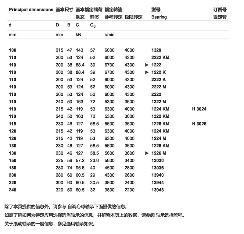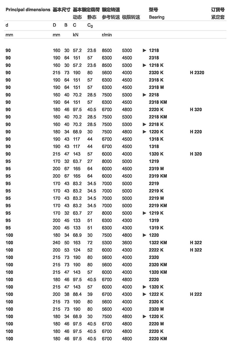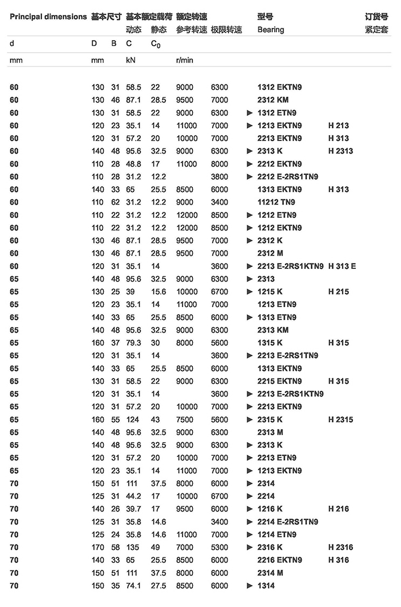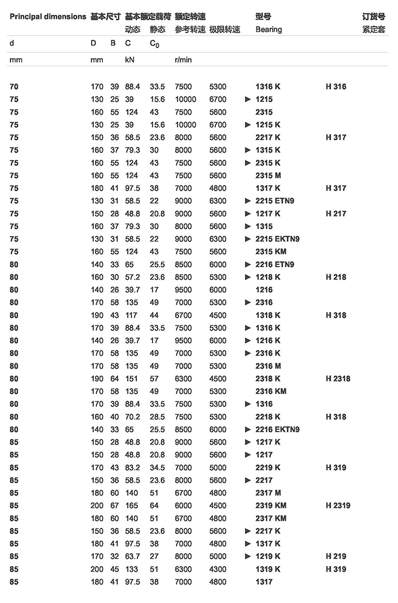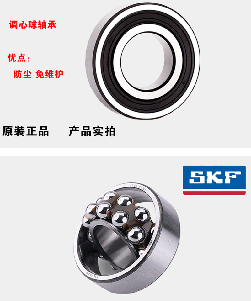 ·圆柱孔调心球轴承带有两列滚球和在外圈中的弧面滚道,导致轴承能够自动调心,并且能够承受轴与轴承座之间的角度误差,特别适用于容易出现轴挠曲和不对中的工况。此外,调心球轴承的摩擦是所有滚动轴承中较低的,使其即使在高速转速下温度上升仍旧缓慢。圆柱孔调心球轴承的制造商物料号后缀的含义如下: ·E:优化的内部设计。 ·TN9:塑料保持架。