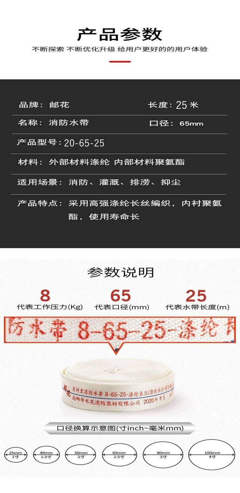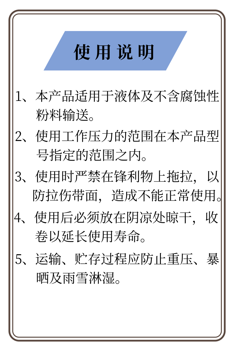 ·承受压力高,耐磨损,耐霉腐,不易渗漏,经久耐用,可任意弯曲折叠,使用方便