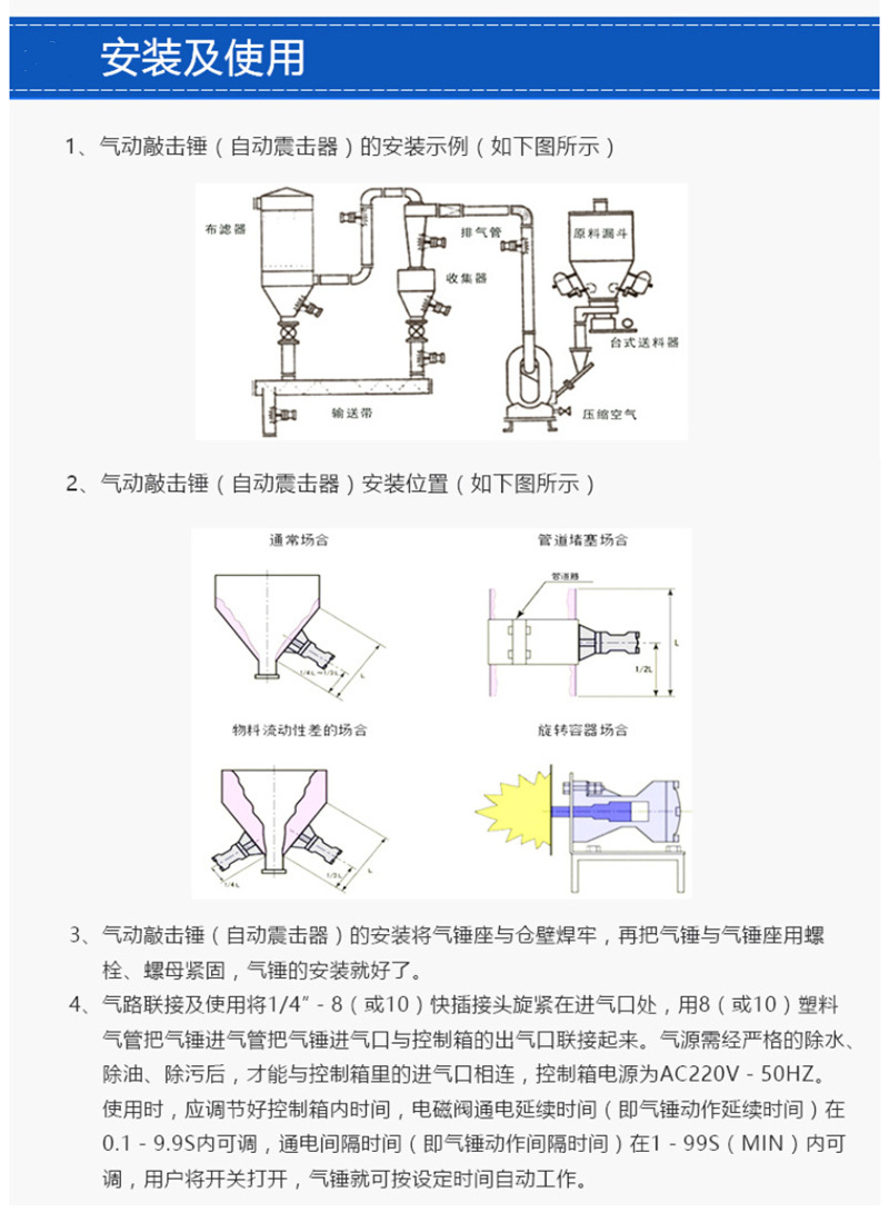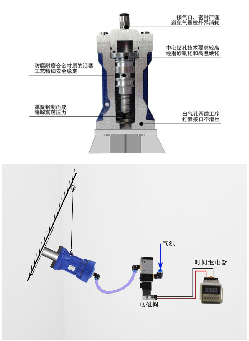 ·高强度铝结构,重量轻,强度大;单击式,每次动作产生一个冲击波;·用以自动防止粉体在管路、料斗、料仓输送中产生的粘附、堵塞和架桥,而对设备的器壁均不会产生操作和变形