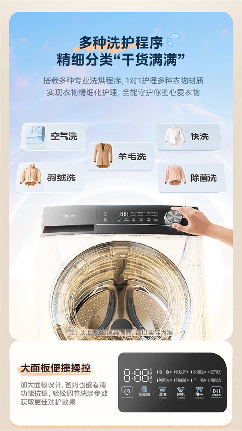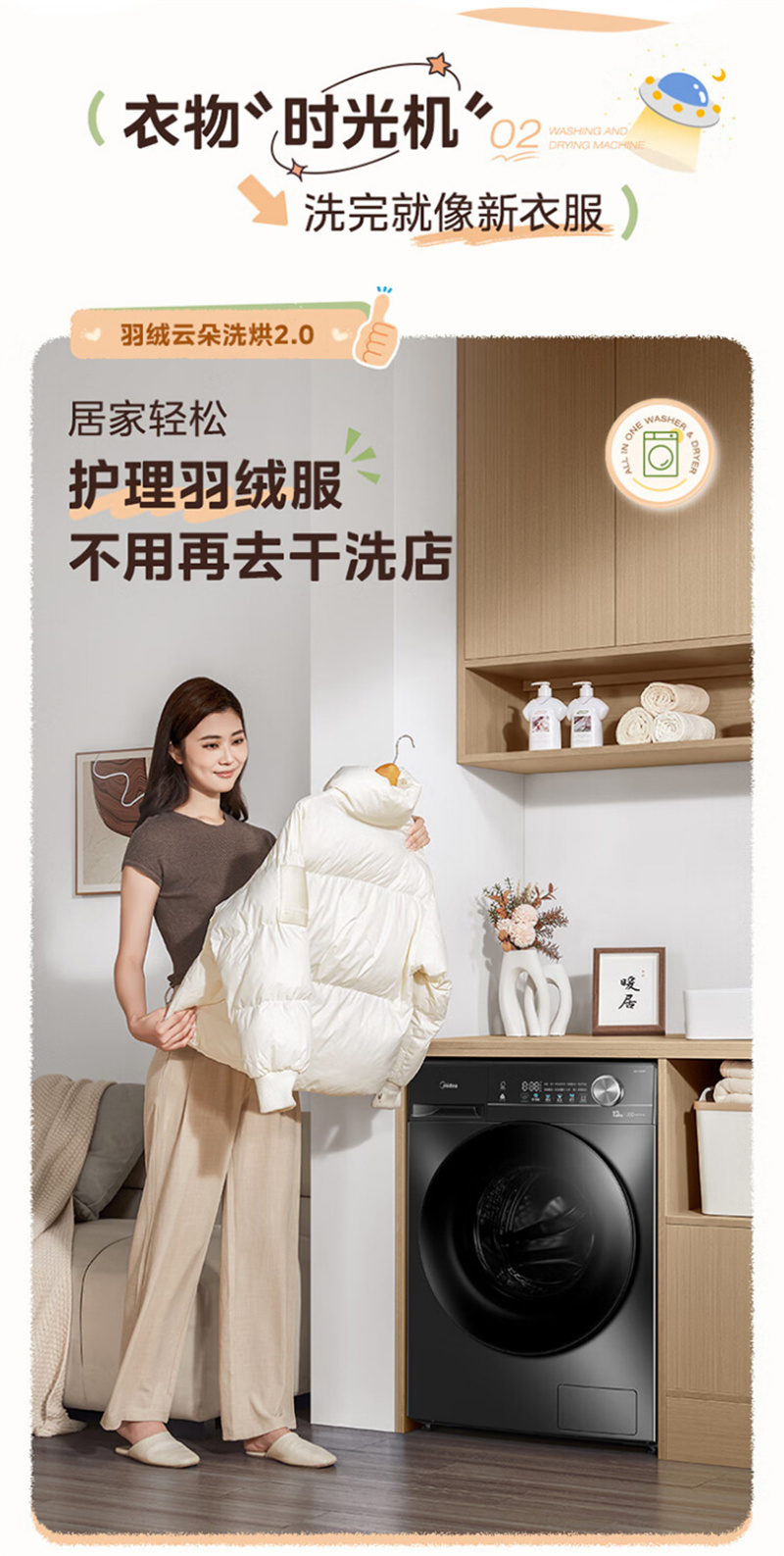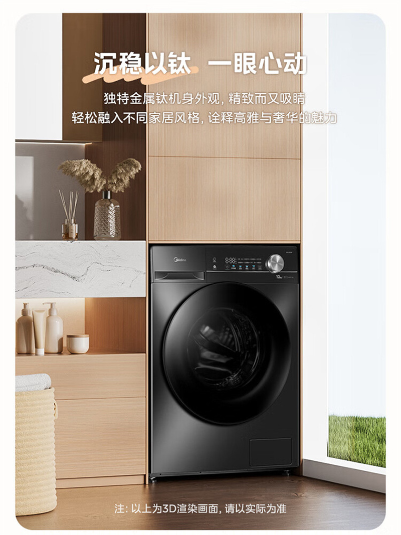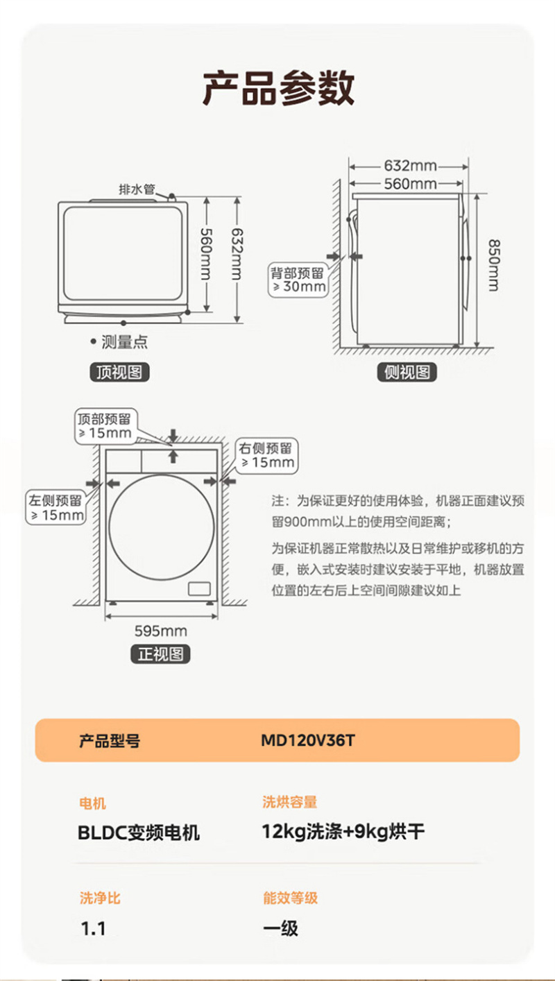 220一级能效含基础安装人工洗涤12/烘干9595×632×850mmMIDEA/美的MD120V36T洗烘一体机