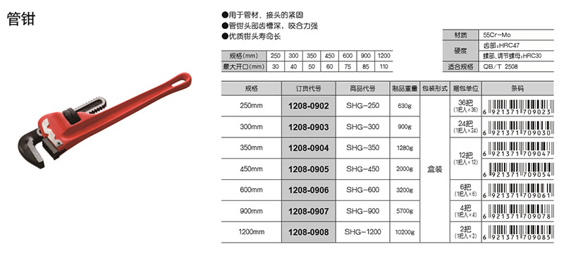 ·管钳 ·采用优质玛钢制造,加长活动钳口,开口量大 ·钳口优质:55CrMo钢 ·钳口整体热处理后齿部高频(二次热处理),硬度高,扭力大 ·钳口不易磨损打滑及断裂,使用寿命长