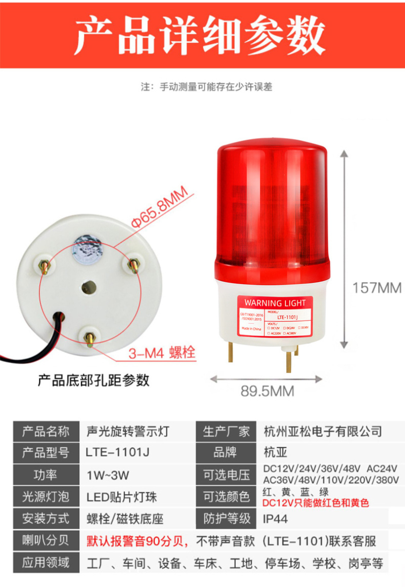 HANGYA/杭亚 LED旋转警示灯 LTE-1101J螺栓有声/DC24V 1~3W 红色 非质量问题不退不换 1个