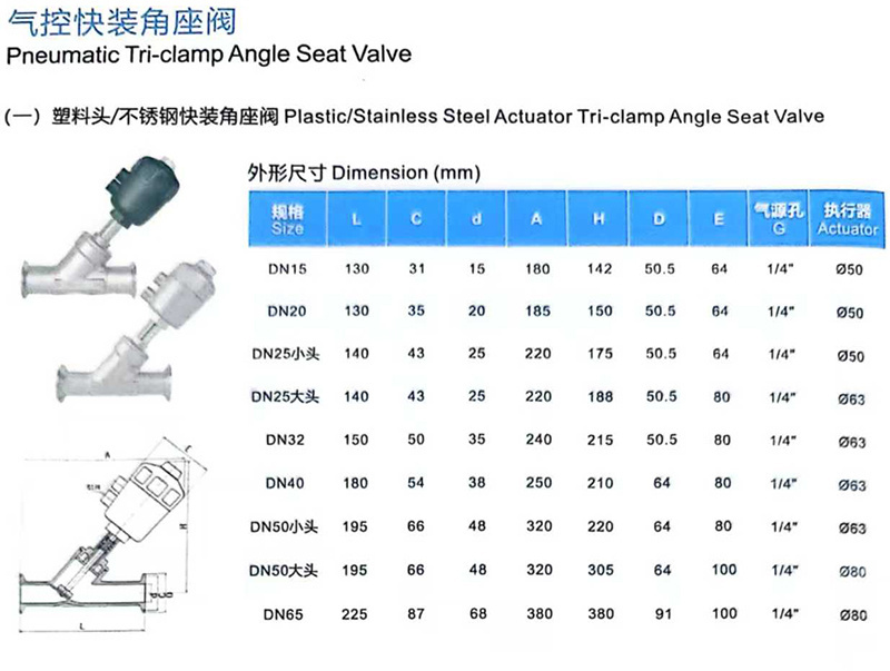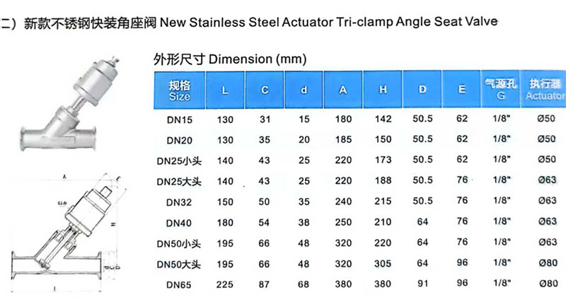 DN15 常闭 不锈钢头单作用常闭气缸130mmPN60~80℃卡箍F304DN151/8"304不锈钢JXV/锦信阀门新款304不锈钢快装气动角座阀