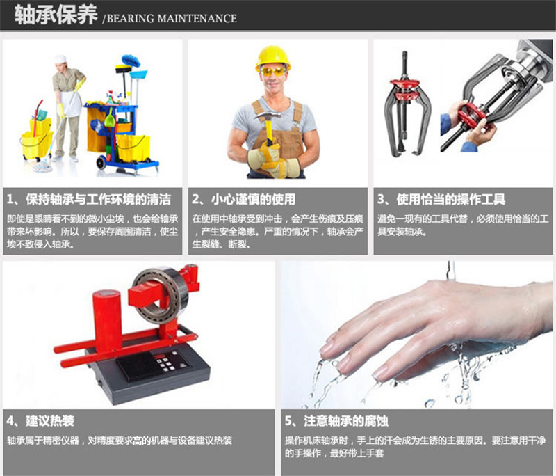 ·安装前根据轴承尺寸大小和应用环境,采取不同的安装方法 ·安装前准备好各种必要设施,同时保持零件具有较好的清洁度 ·安装和使用过程中轴承需要保持轴承和环境的清洁,避免尘埃侵入轴承 ·使用过程中需要避免给轴承产生冲击,以免造成轴承损伤 ·使用过程中需要选择合适的操作工具 ·使用过程中需要避免潮湿的环境,防止轴承锈蚀